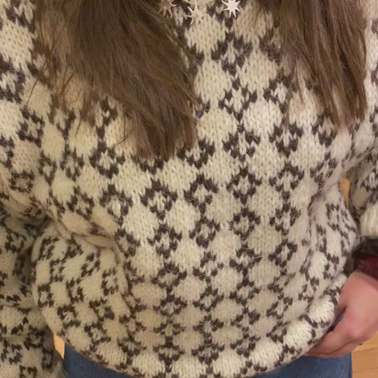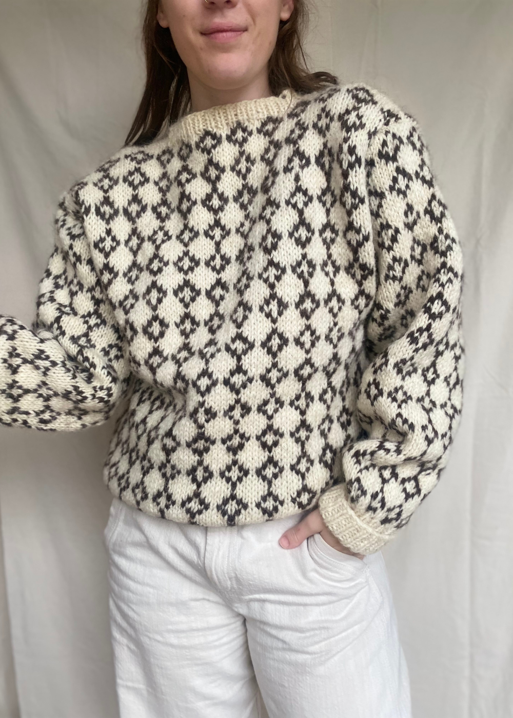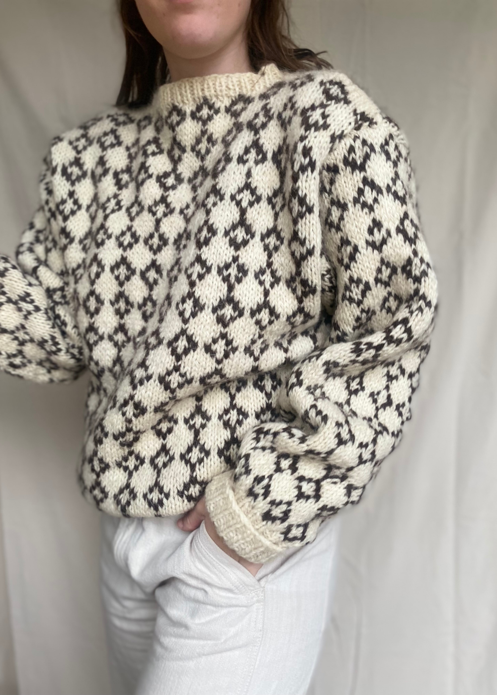 Deze wollen trui is vermoedelijk met de hand gebreid door de vorige eigenaar, wat het pareltje nog persoonlijker maakt en karakter geeft. De brede kraag voegt een klassiek detail toe en maakt de trui extra cosy.
