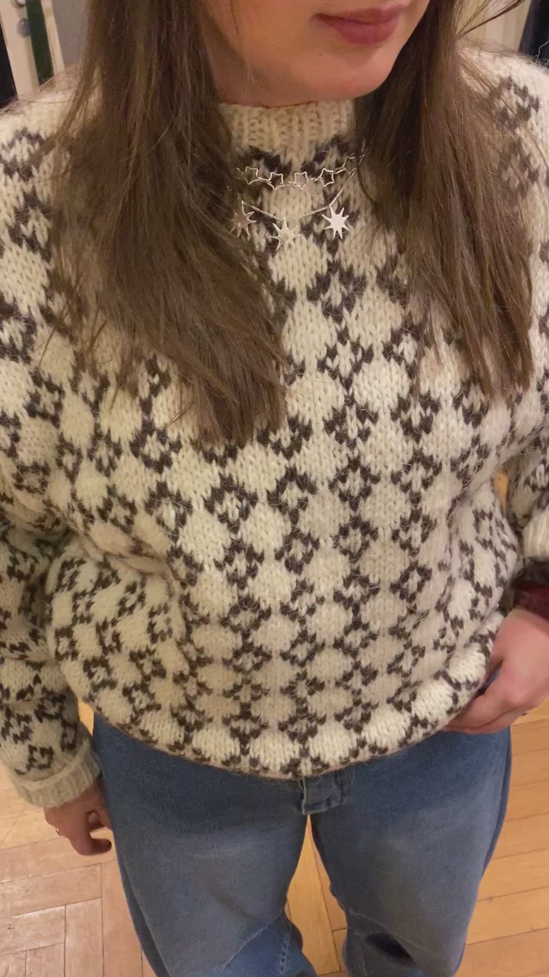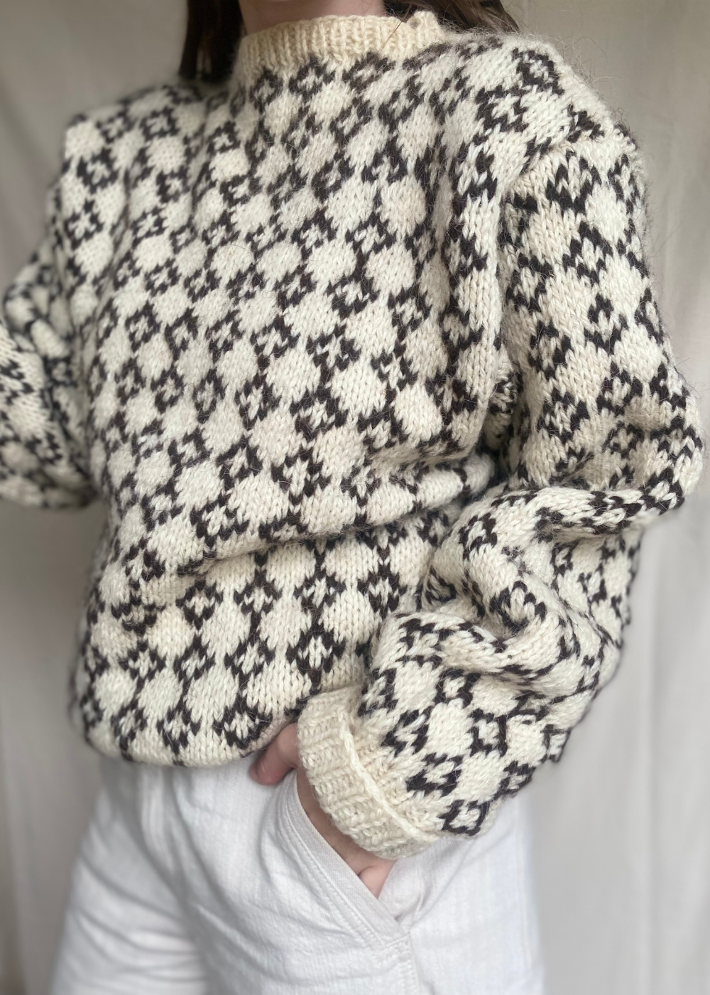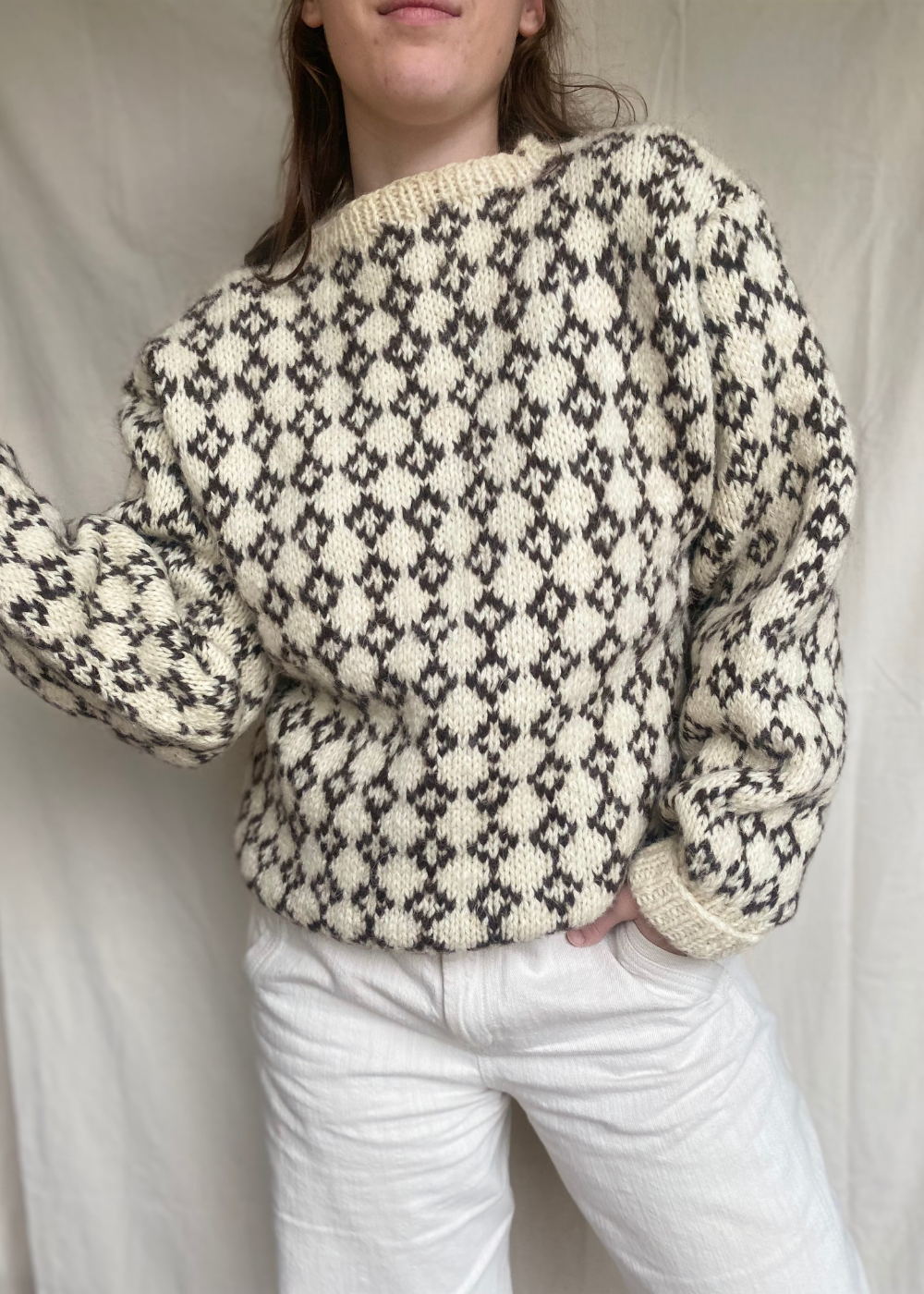 Deze wollen trui is vermoedelijk met de hand gebreid door de vorige eigenaar, wat het pareltje nog persoonlijker maakt en karakter geeft. De brede kraag voegt een klassiek detail toe en maakt de trui extra cosy.