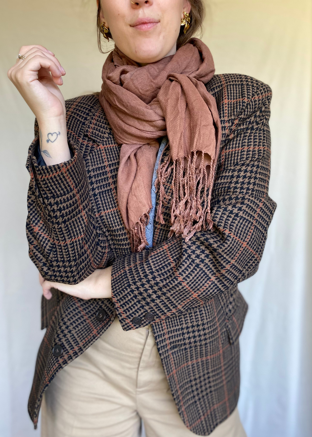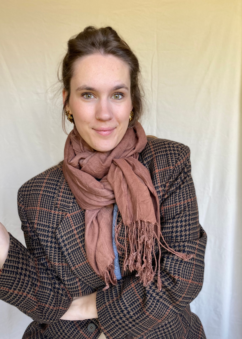 Deze bruine katoenen sjaal is de perfecte accessoire voor dagen waarop een wollen sjaal net te warm aanvoelt. Het katoen is licht en zacht, waardoor je hem gemakkelijk kunt dragen tijdens dit seizoen.