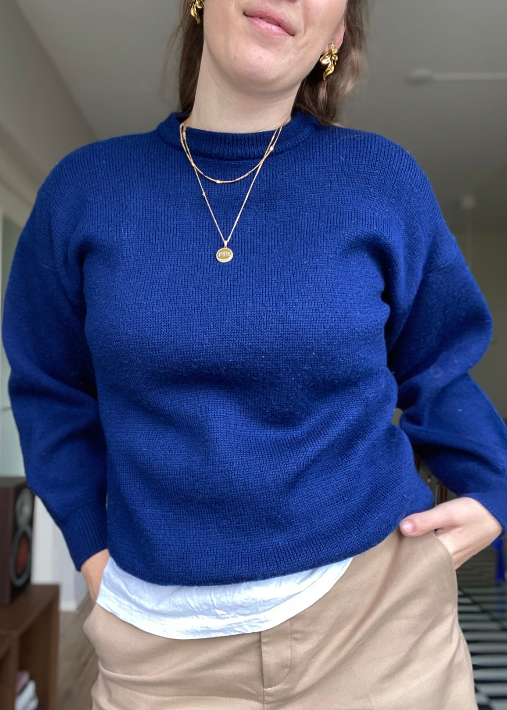 Deze donkerblauwe vintage trui is gemaakt van hoogwaardige lana wol: een fijne kwaliteit die zacht draagt en lang mooi blijft. Het minimalistische ontwerp maakt dit een tijdloos item dat je eindeloos kunt combineren. Draag de trui casual met een straight jeans en sneakers, of combineer hem met een pantalon voor een klassieke look.