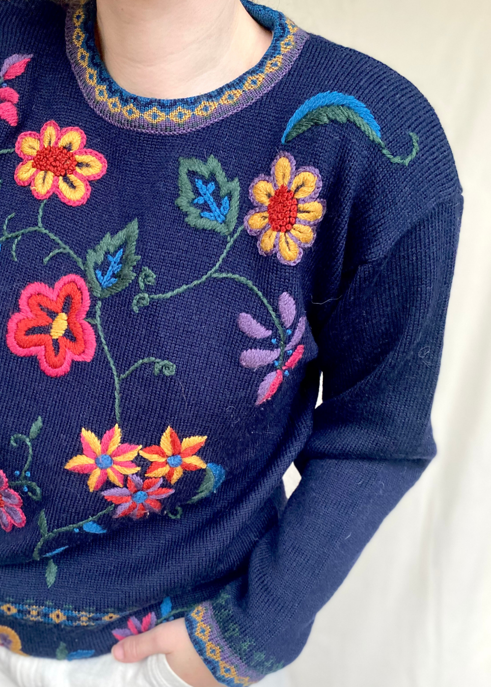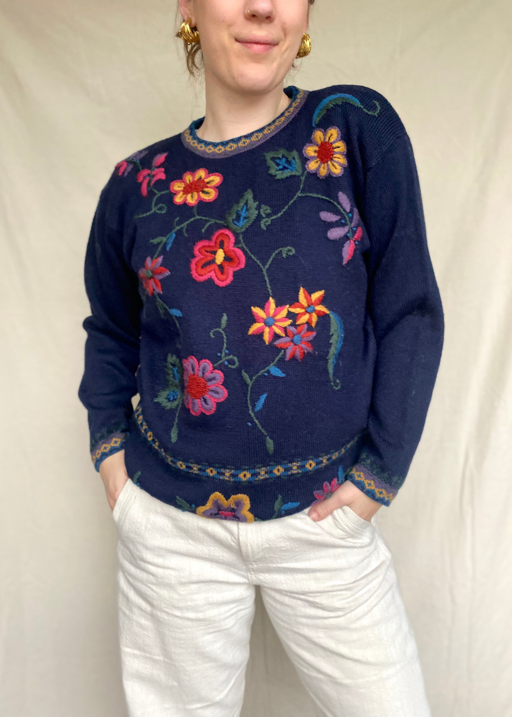Een donkerblauwe trui die versierd is met geborduurde bloemen voor een unieke touch. Combineer met een jeans en laarsjes voor de perfecte winteroutfit: comfortabel, warm en stijlvol.