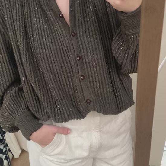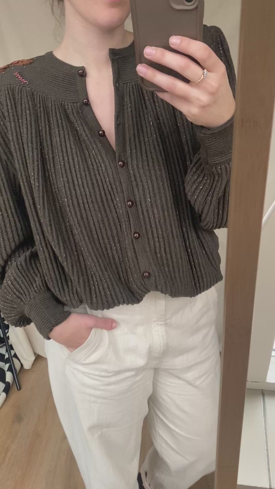 Een prachtig item met schoudervullingen, bruine knopen, kralen, glitterdetails en subtiele plooien. De combinatie van vakmanschap, details en het silhouet maken dit een van de mooiste en meest unieke stukken in de collectie. Stijlvol te dragen met een lichte jeans en toffe oorbellen voor een complete look.