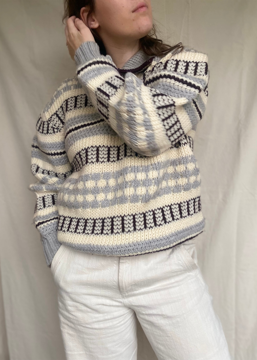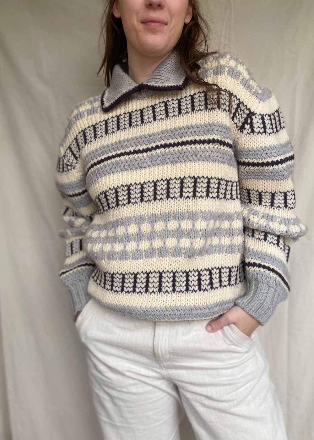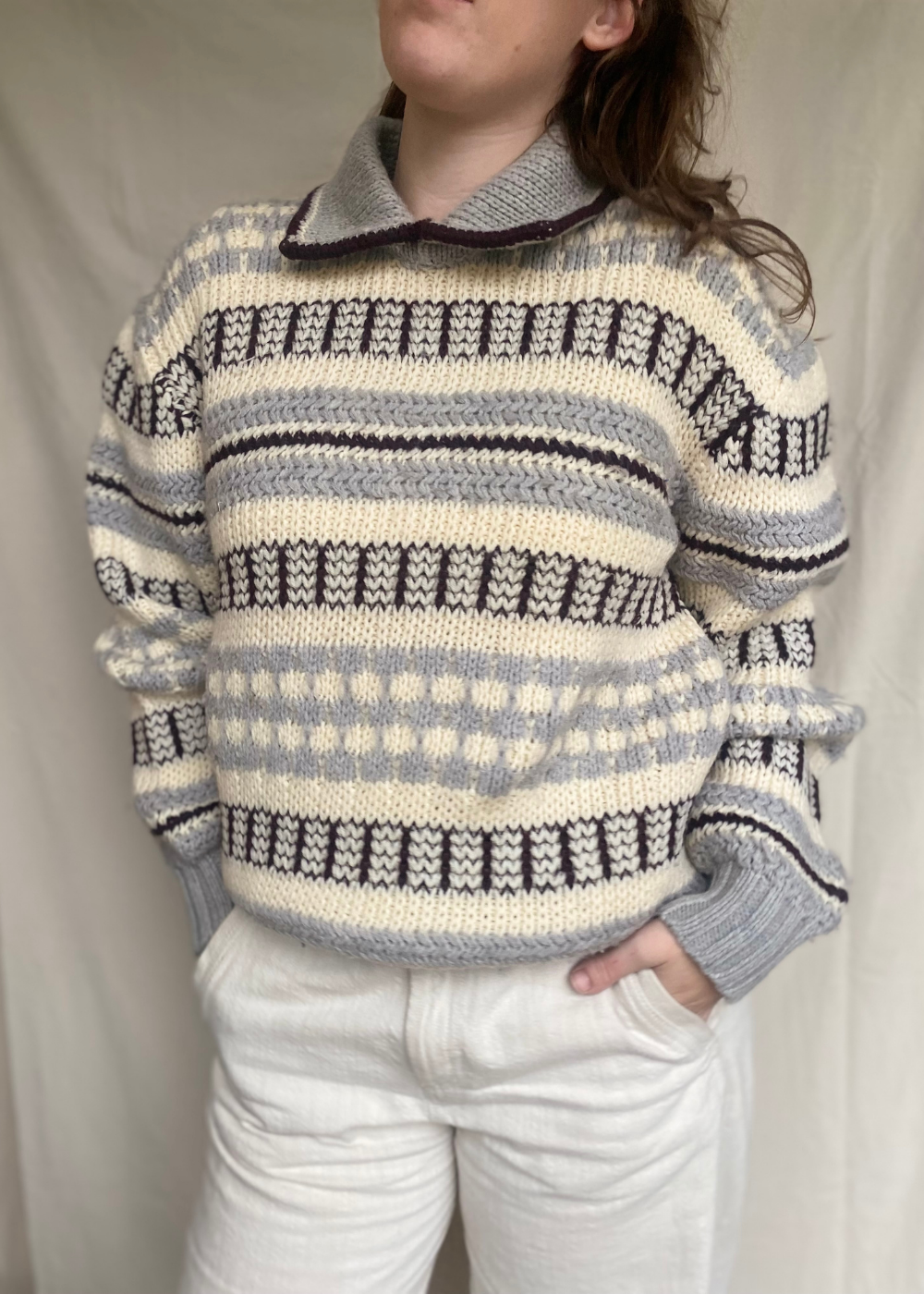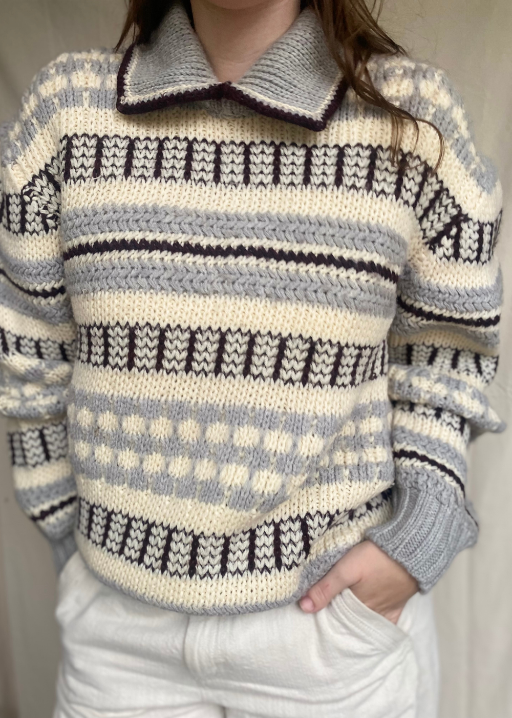 Deze gebreide trui is gemaakt van een comfortabele katoenmix, geen wol dus, maar wel heerlijk zacht en ademend. Het strepenpatroon geeft de trui een uniek design, terwijl de kraag zorgt voor een opvallend en eigentijds detail.