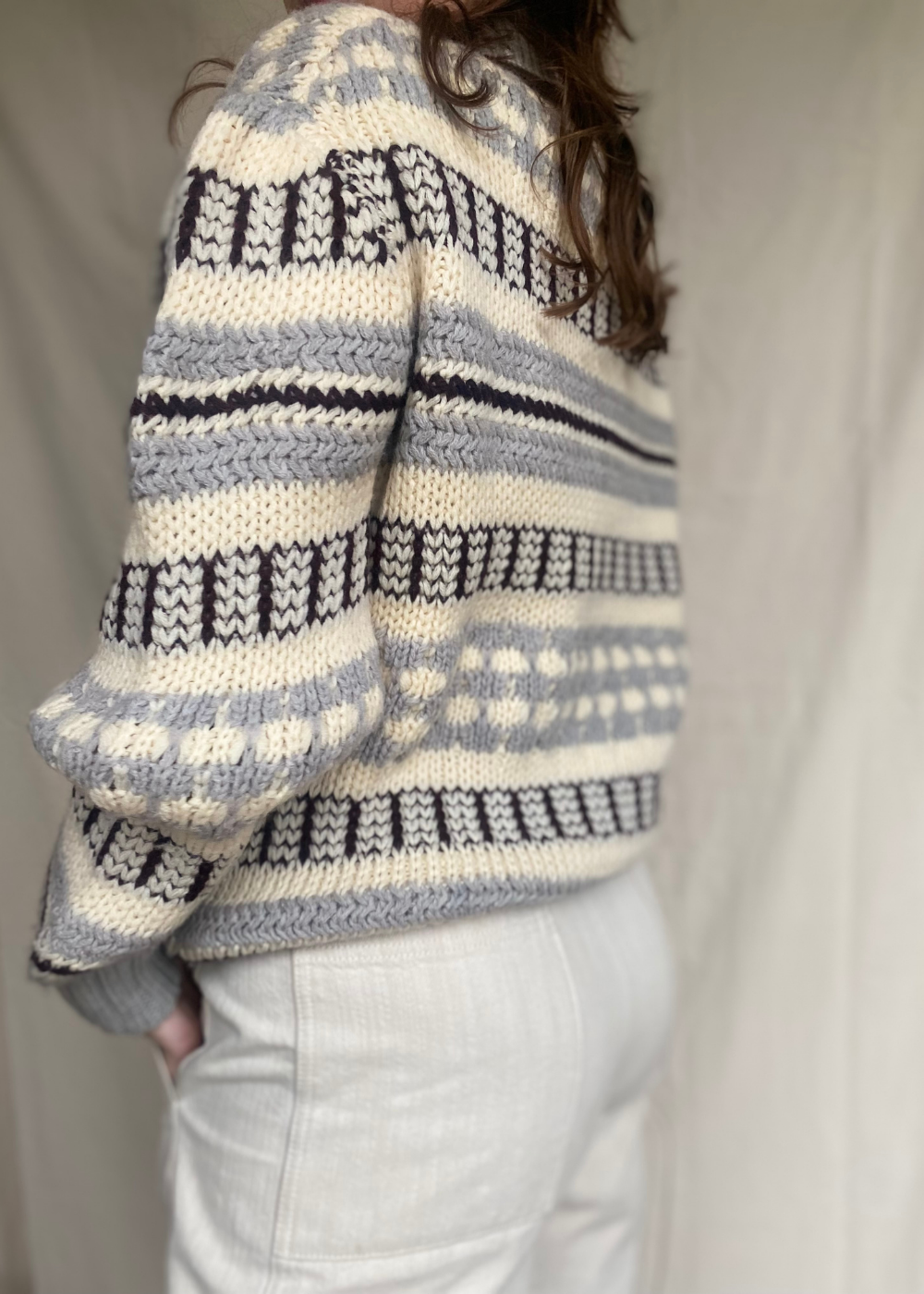 De schoudernaad loopt door op de bovenarm, hierdoor vormt de trui zich aan jouw lichaam