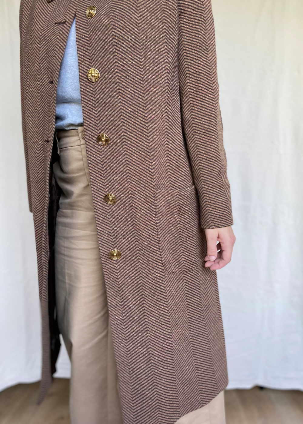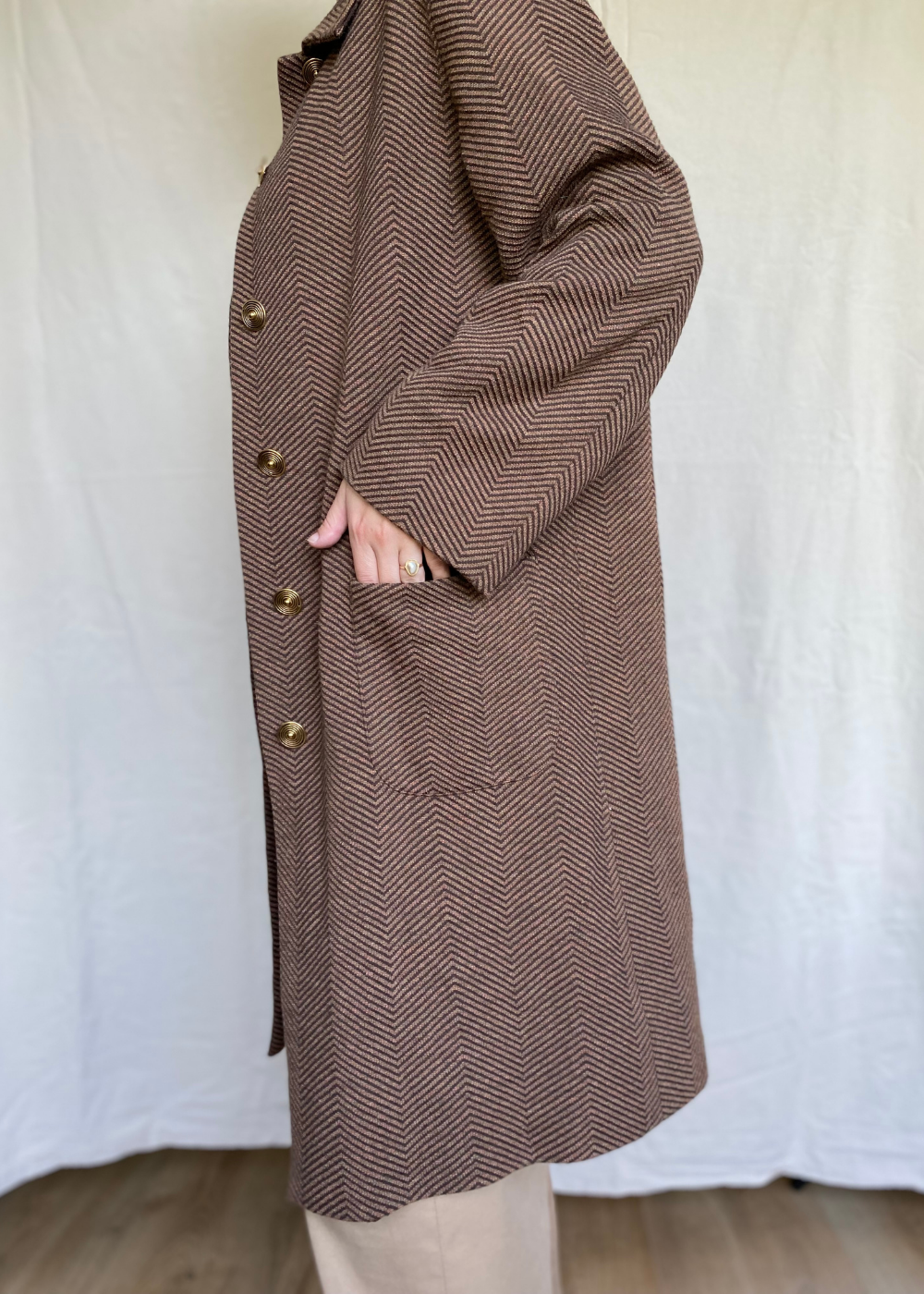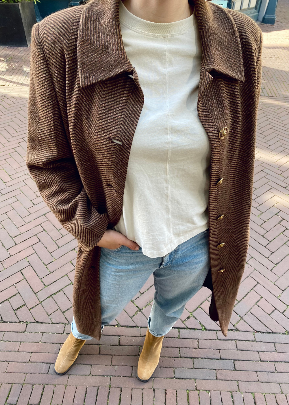 Deze stijlvolle tussenjas is gemaakt van een soepele katoenblend en afgewerkt met gouden knopen zoals je het alleen ziet bij vintage pareltjes. Het subtiele bruin/zwart streepje geeft de jas een chique en tijdloze uitstraling. Praktisch én mooi, met handige zakken aan de voorkant.