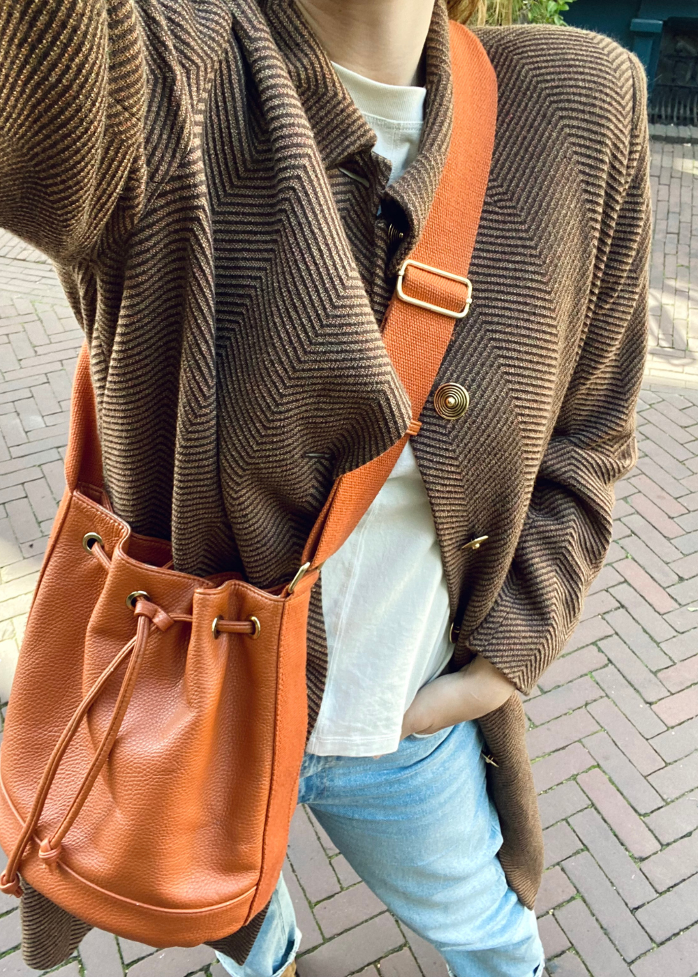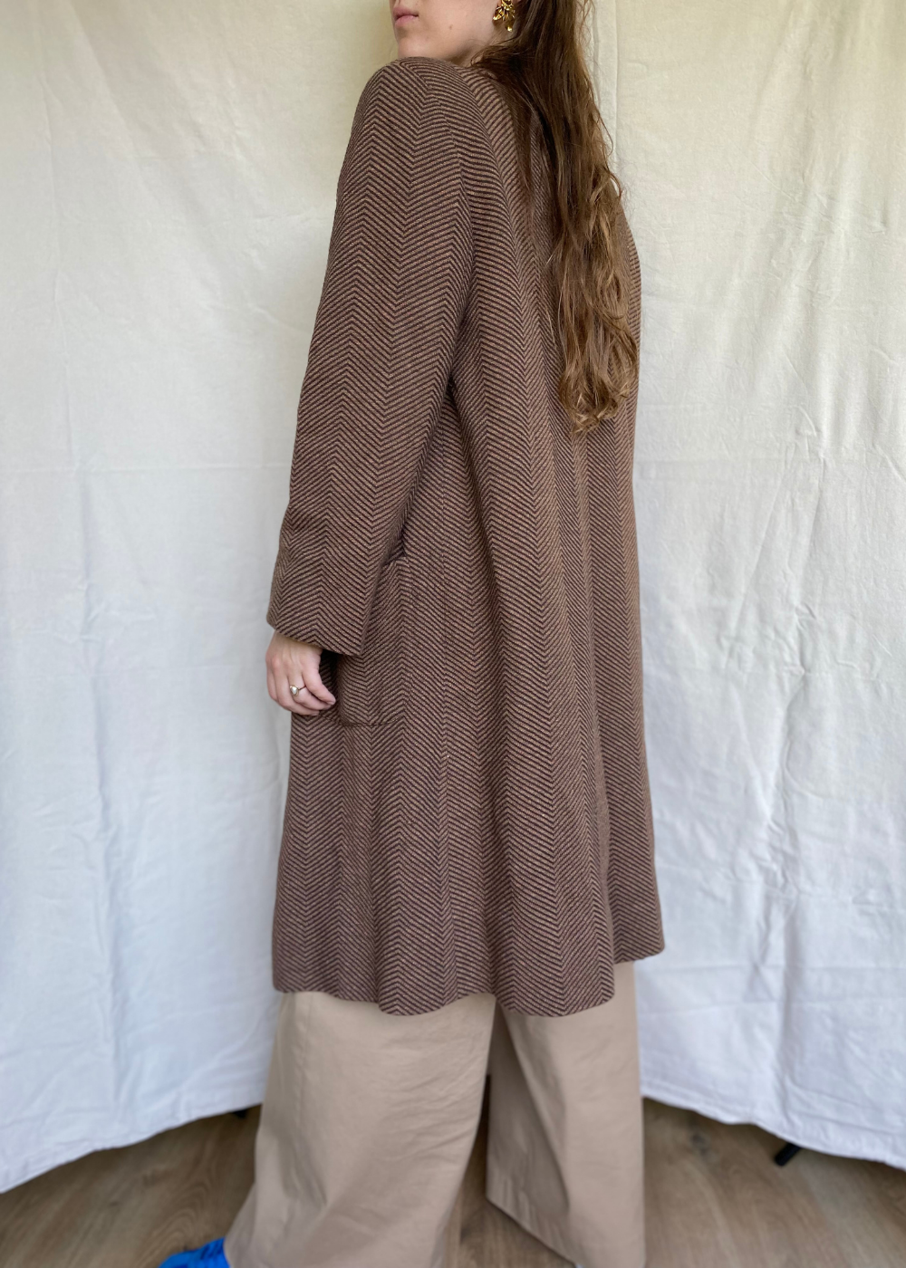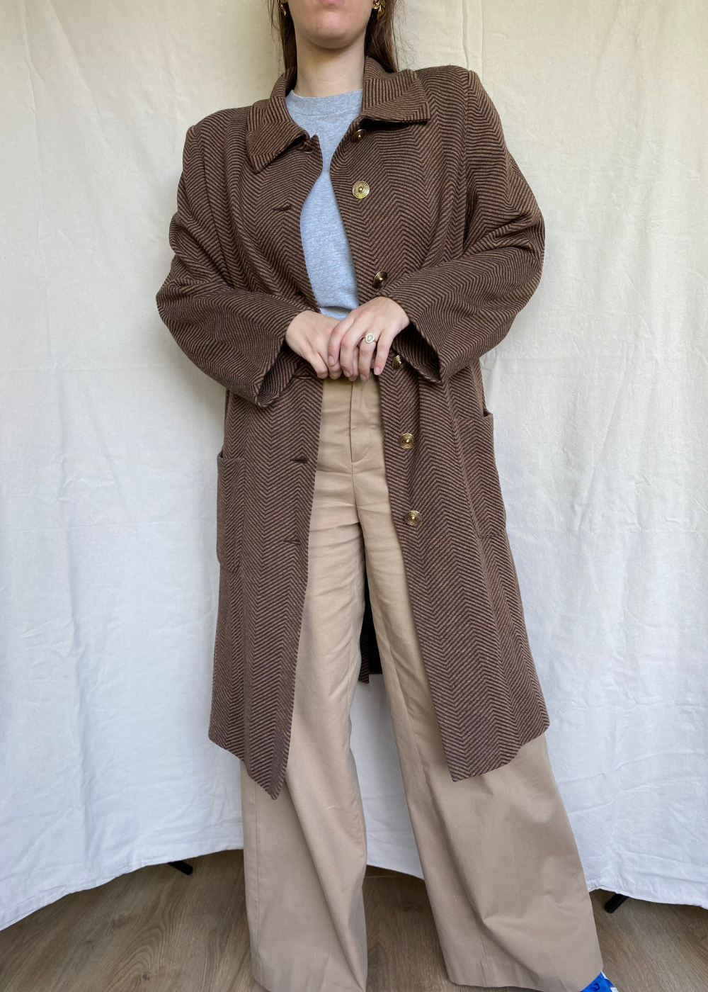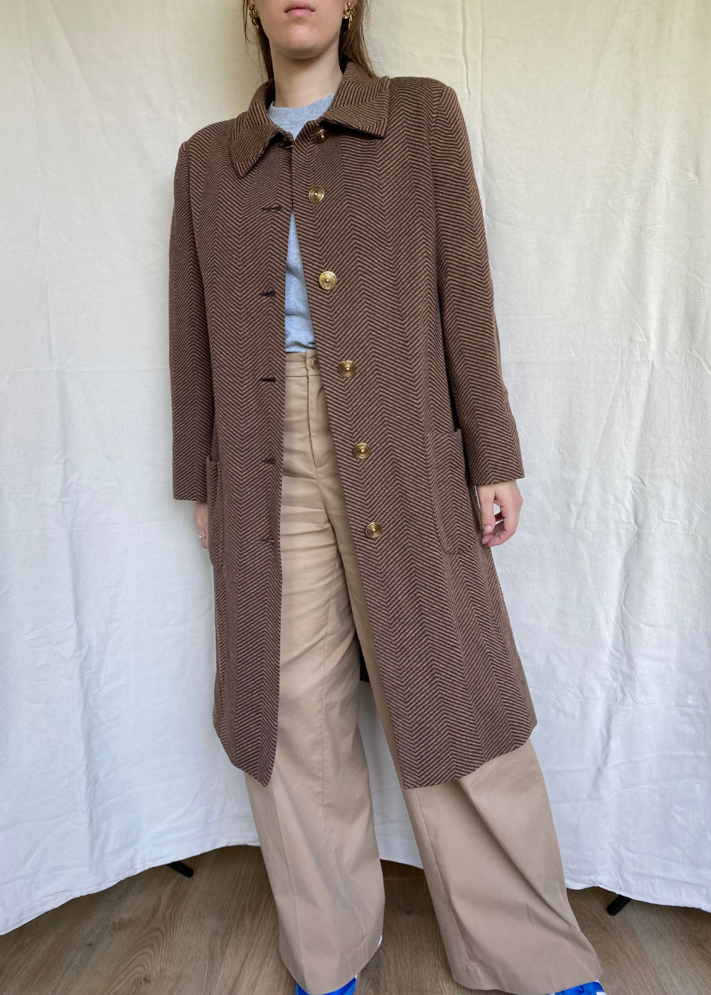 Deze stijlvolle tussenjas is gemaakt van een soepele katoenblend en afgewerkt met gouden knopen zoals je het alleen ziet bij vintage pareltjes. Het subtiele bruin/zwart streepje geeft de jas een chique en tijdloze uitstraling. Praktisch én mooi, met handige zakken aan de voorkant.