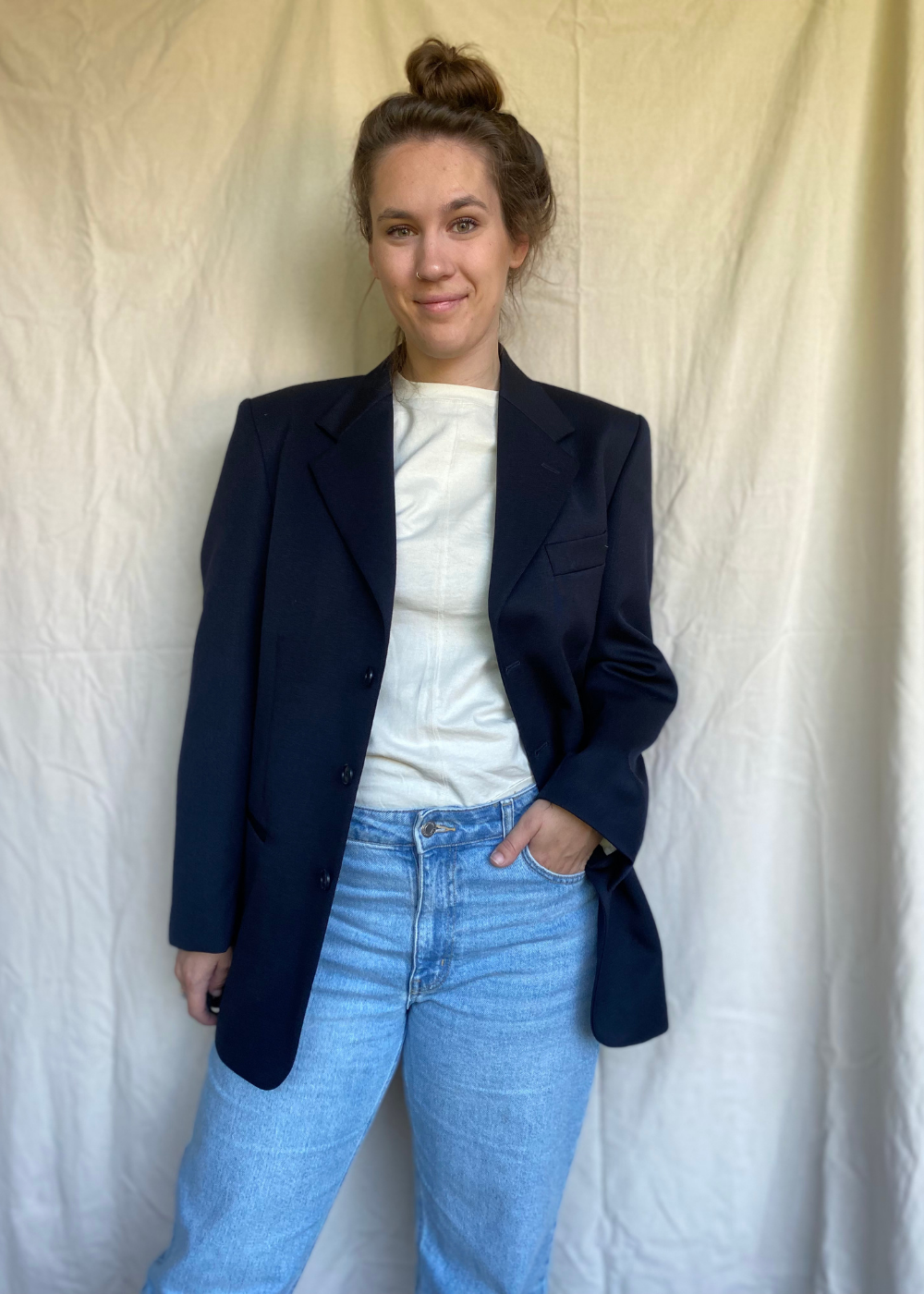 Een echte tijdloze klassieker: deze donkerblauwe blazer is gemaakt van pure lana wol. Het materiaal valt zacht, warm en comfortabel. En in tegenstelling tot veel wolsoorten kriebelt het niet. De blazer is in perfecte staat en voelt als een kwaliteitsstuk dat jarenlang meegaat.
