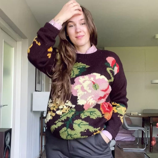 Deze bruine vintage trui van zachte lana wol voelt heerlijk comfortabel en is bijzonder door de bloemenpatroon dat in het breisel is verwerkt. Ook de boordjes zijn met oog voor detail afgewerkt, waardoor dit een uniek en tijdloos stuk is.