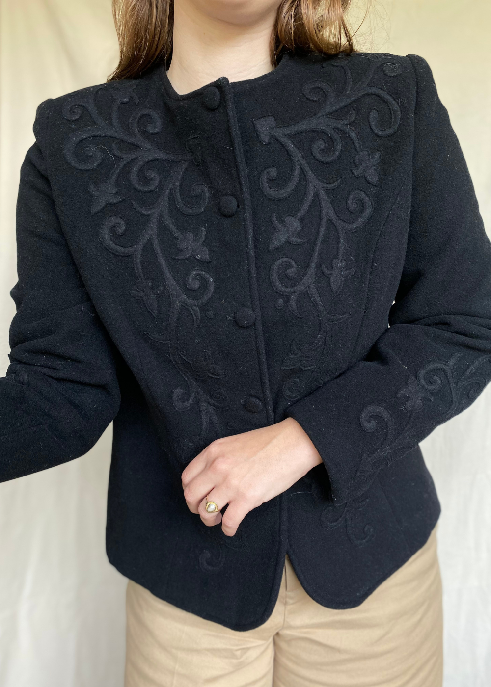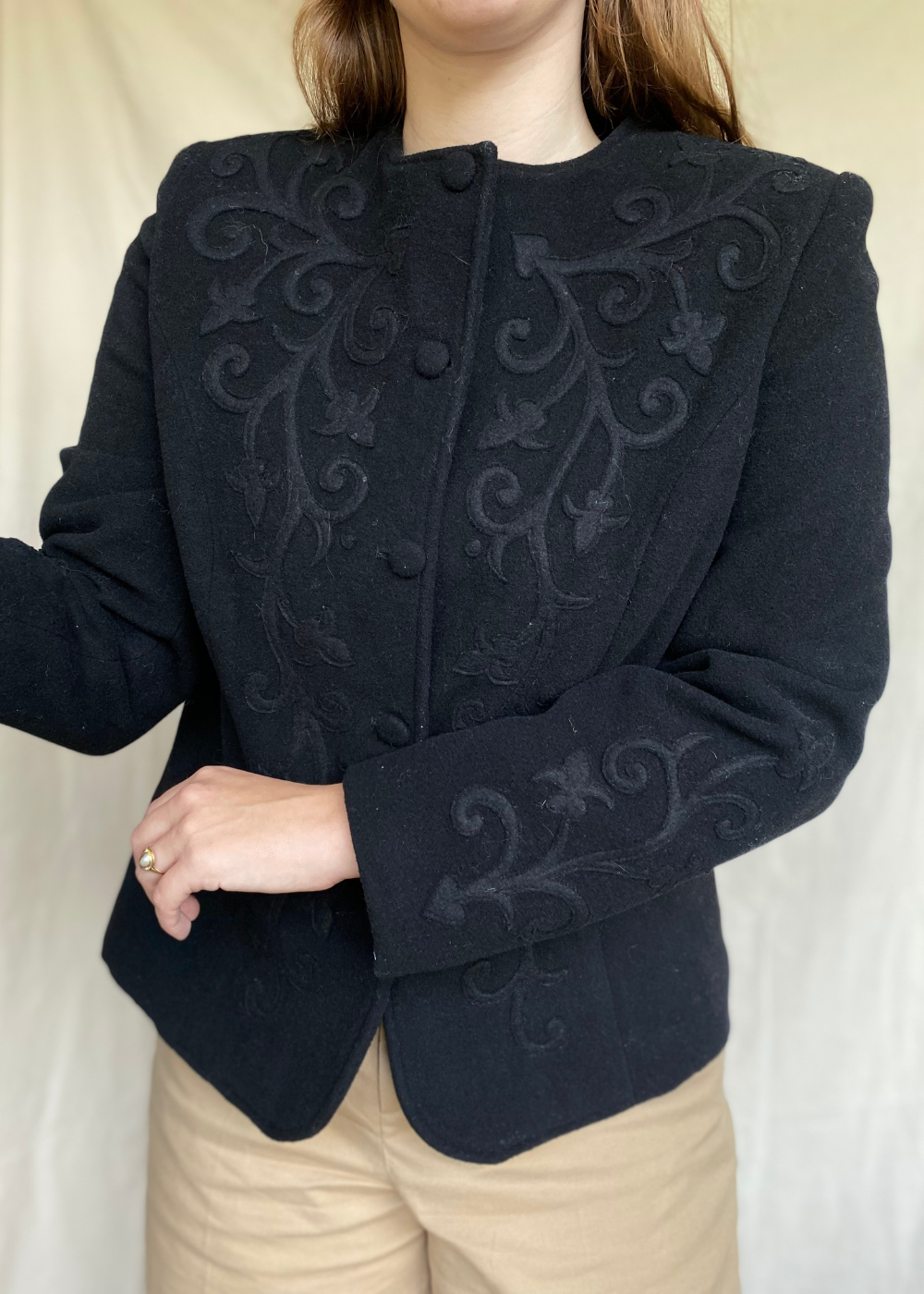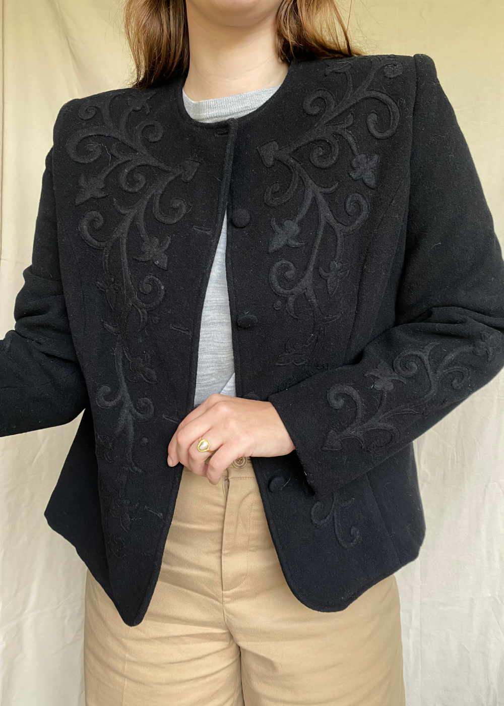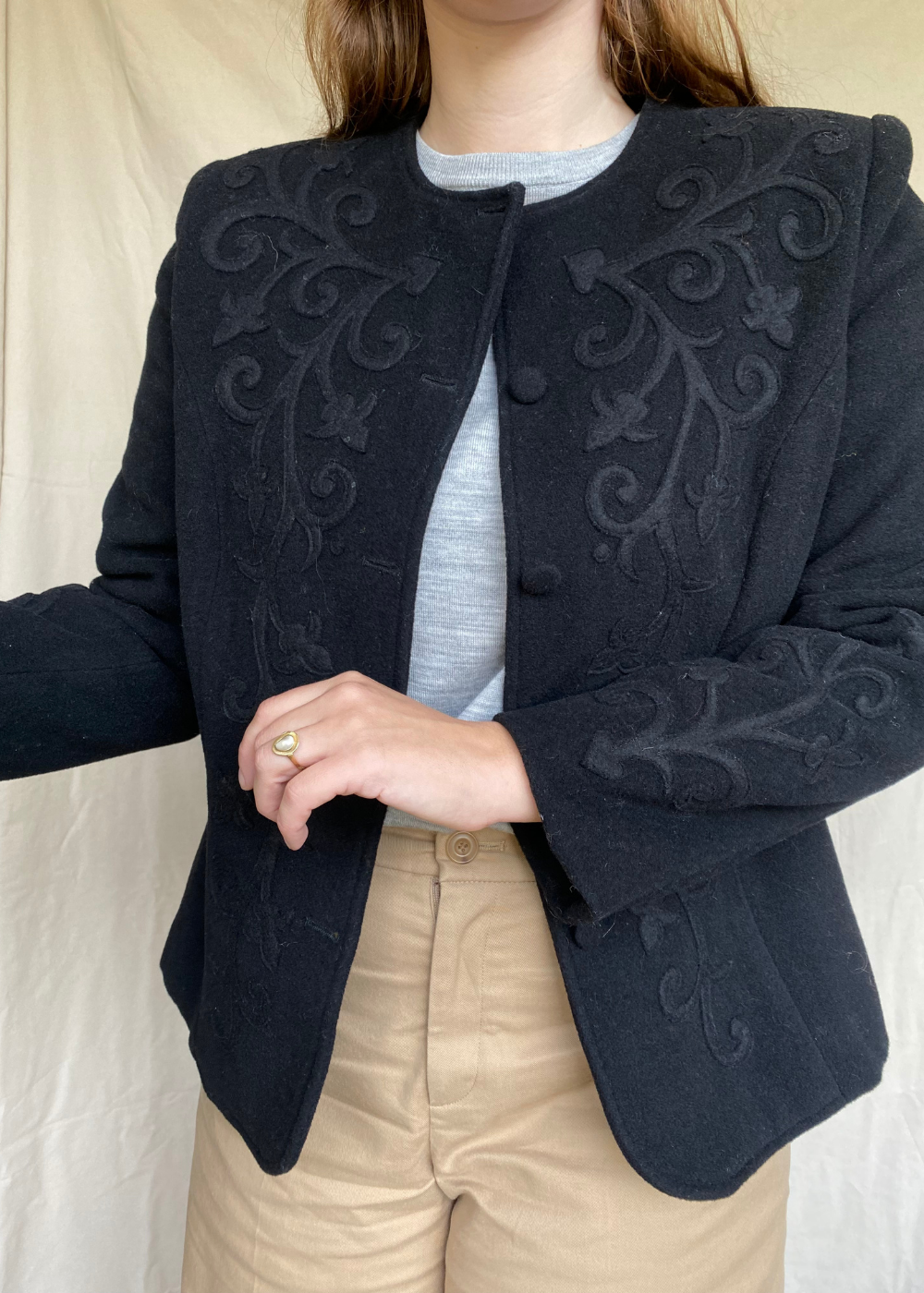 Dit prachtige wollen jasje heeft mooie details op het voorpand, mouwen en achterpand. Combineer dit jasje met een simpel shirt of met een toffe blouse. Als je naar de foto's kijkt kun je soms kleur verschil zien, dit komt omdat de camera de kleur zwart lastig op de foto krijgt. Weet dat het jasje in perfecte staat is en de kleur zwart is.