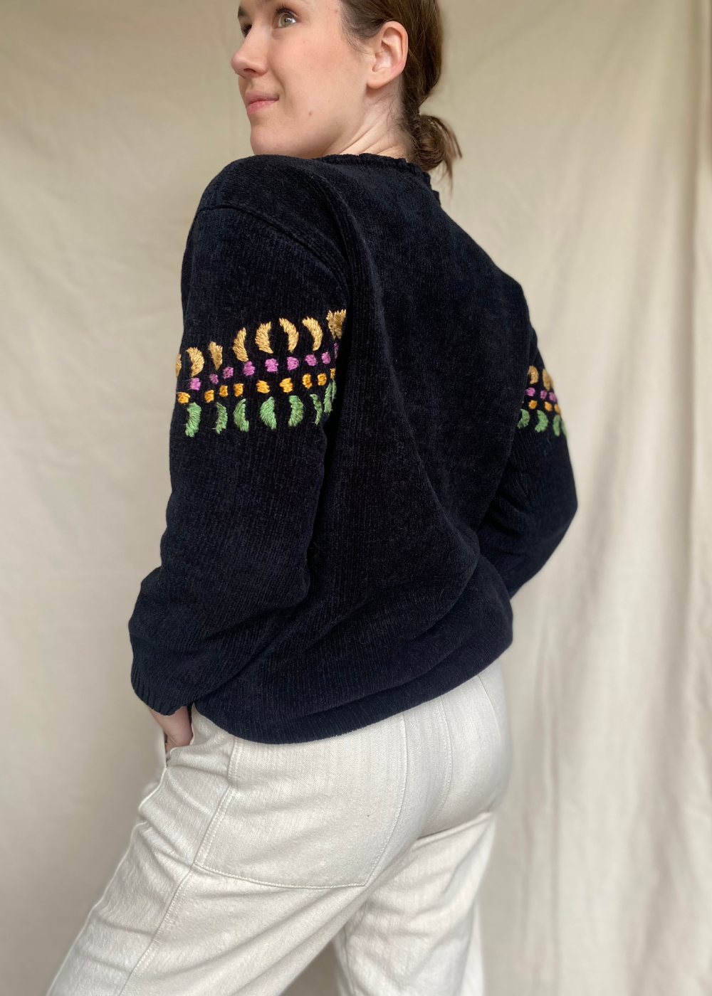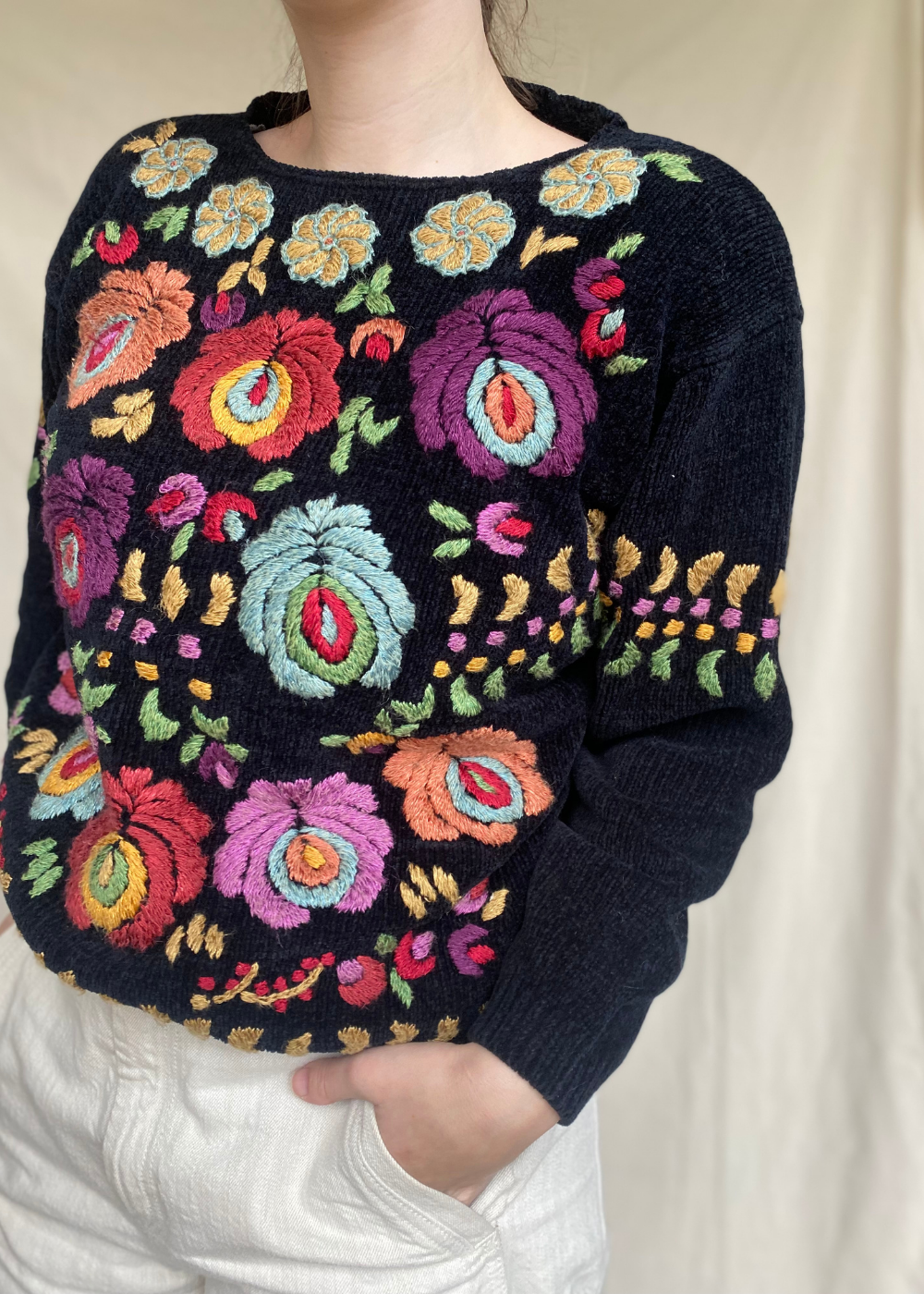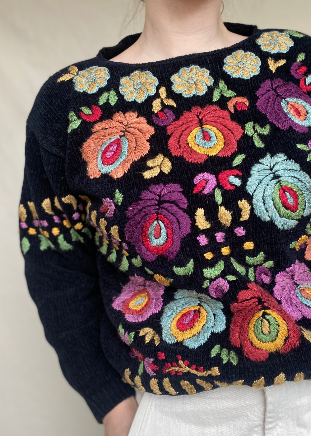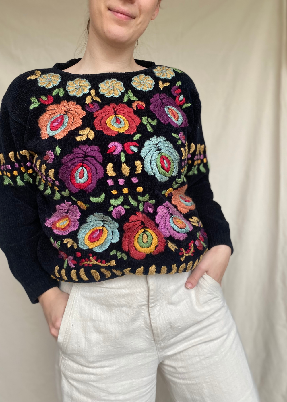 Een zwarte trui die versierd is met geborduurde bloemen voor een unieke touch. Combineer met een jeans en laarsjes voor de perfecte winteroutfit: comfortabel, warm en stijlvol.